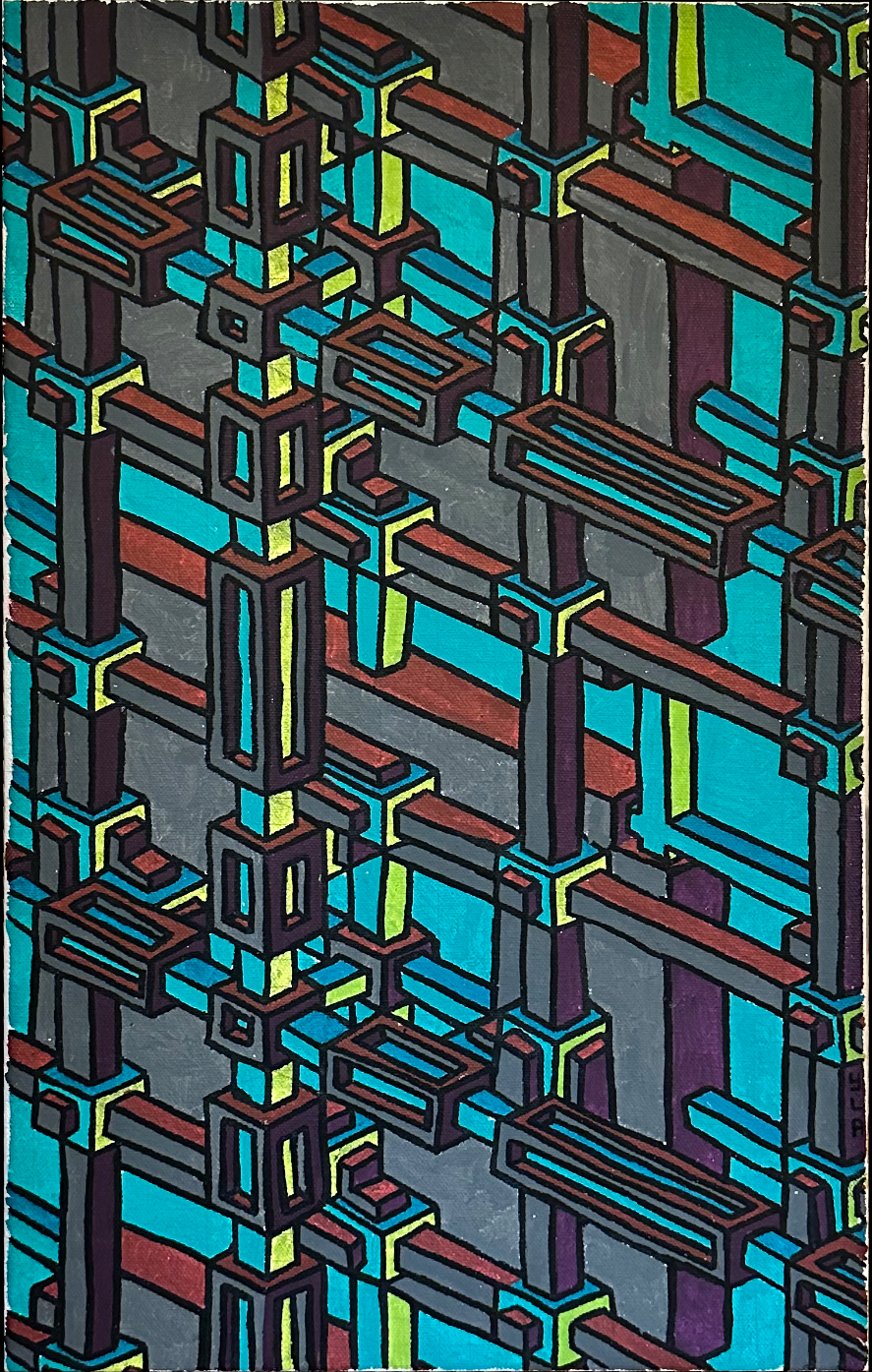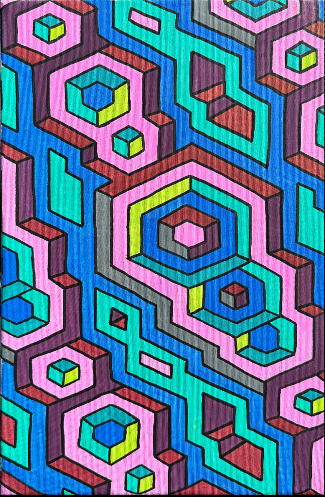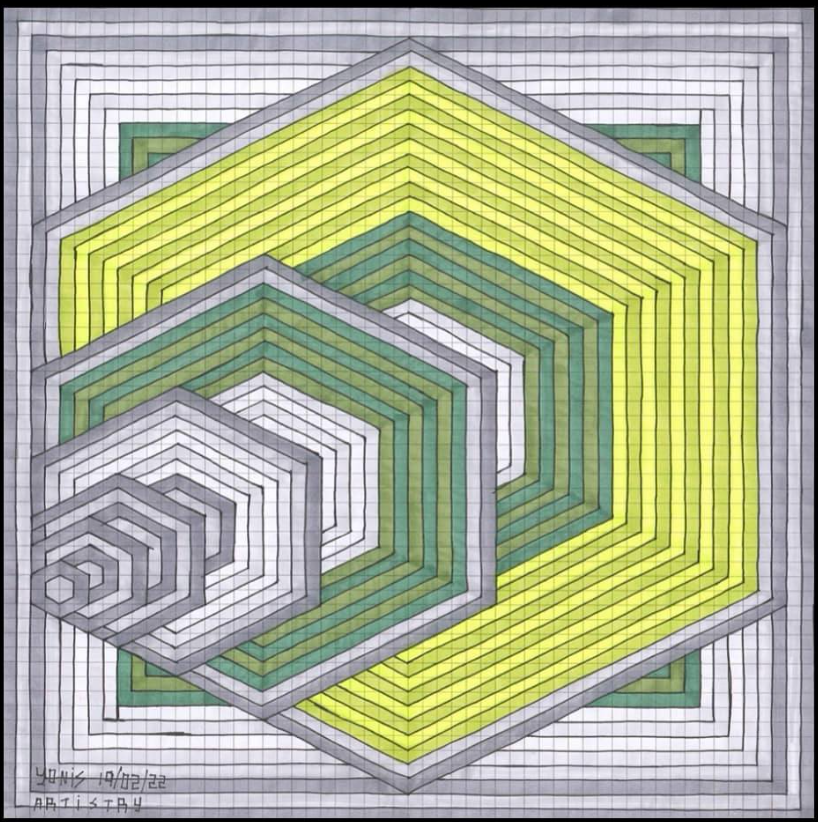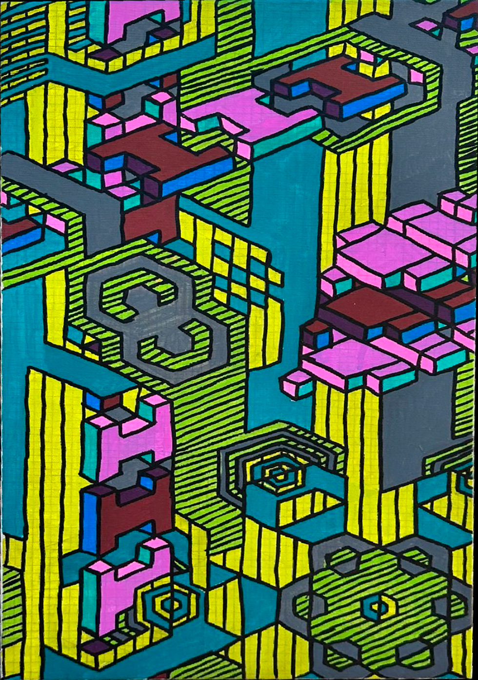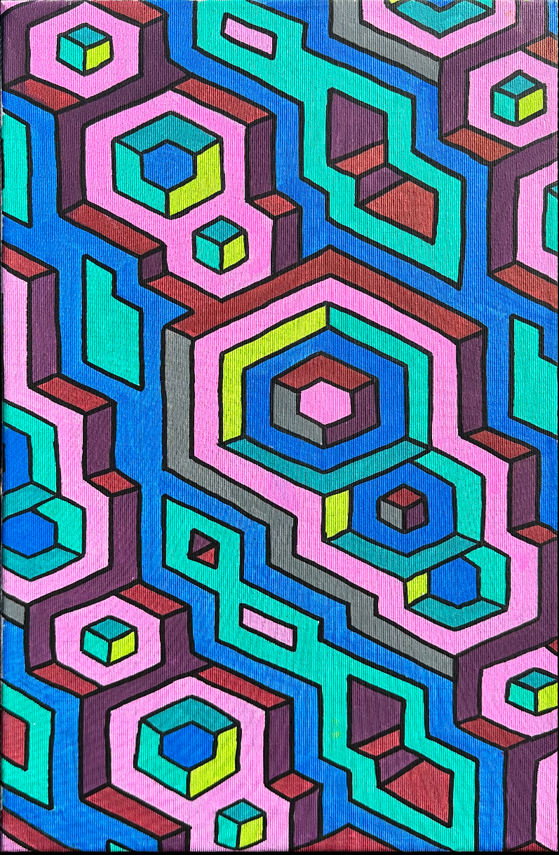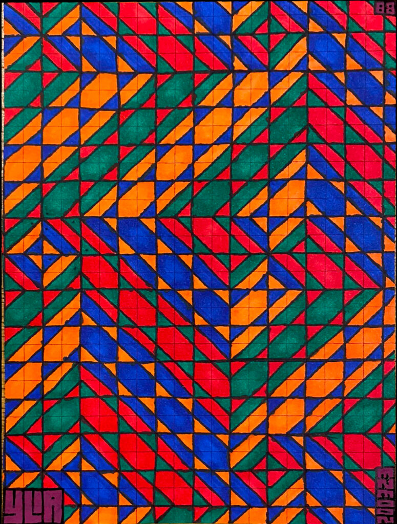 I continue to develop my multidisciplinary practice through YLA Art Magazine, Music theory and composition, my screen-printed clothing, and participation in a variety of events across Europe since 2022. I am currently pursuing a Mathematics major to discover new abstract ideas and apply them directly to the multi-dimensional structure of my paintings.