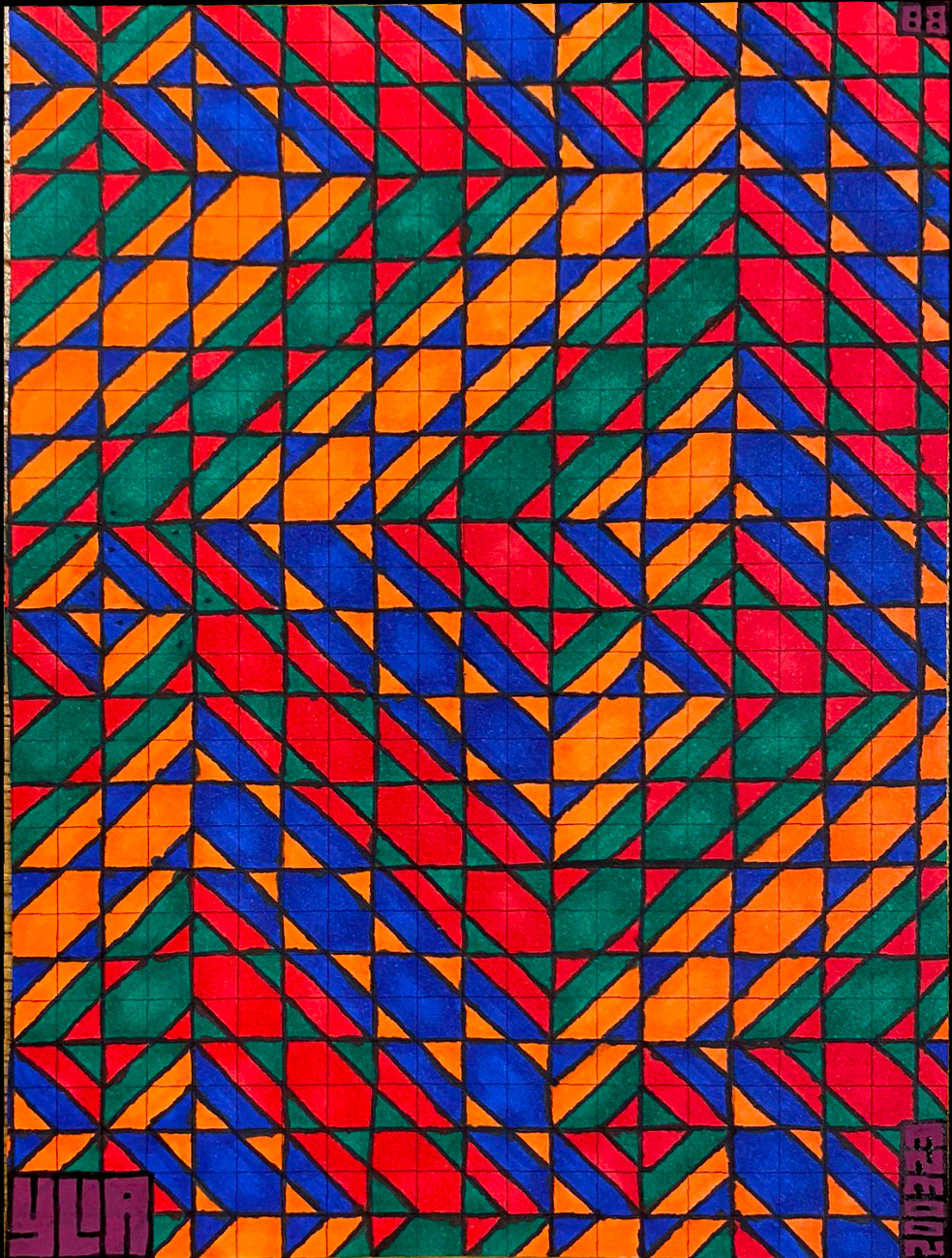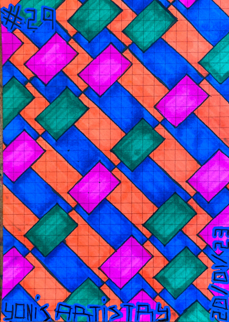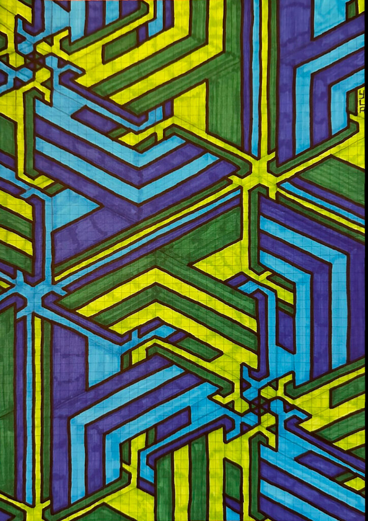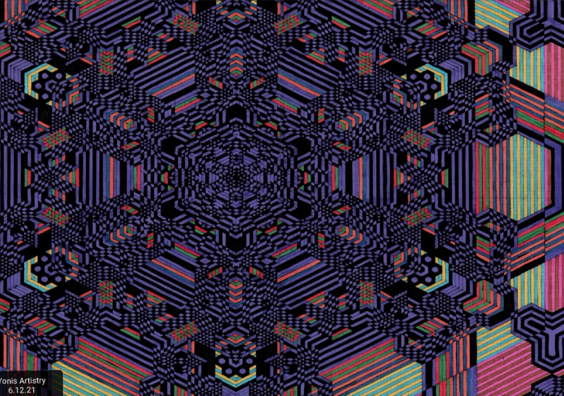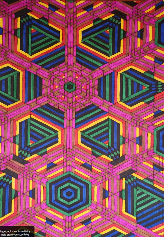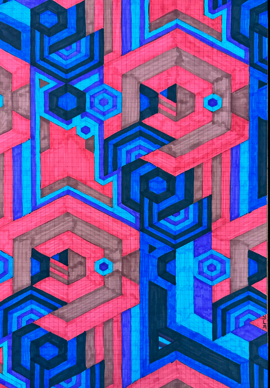 I continue to develop my multidisciplinary practice through YLA Art Magazine, Music theory and composition, my screen-printed clothing, and participation in a variety of events across Europe since 2022. I am currently pursuing a Mathematics major to discover new abstract ideas and apply them directly to the multi-dimensional structure of my paintings.