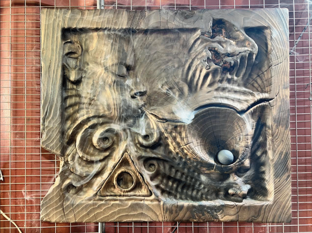 • 26”x30” reclaimed cedar + inverted mirror (glass, silver, mirror-backing paint)