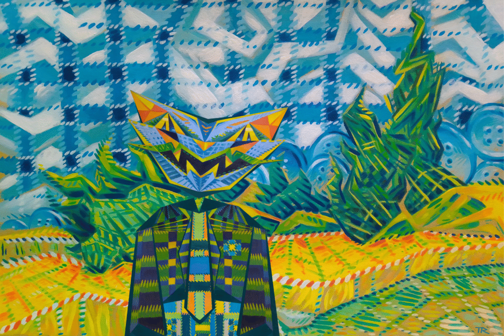 This piece is a digital composition made from two separate paintings. The background is a stylized reinterpretation of Vincent van Gogh’s Cypress Trees, but reimagined in a dreamlike, checkered textile dimension, where everything, the sky, the trees, even the grass is made of fabric.