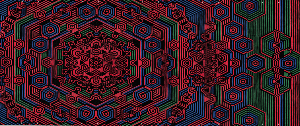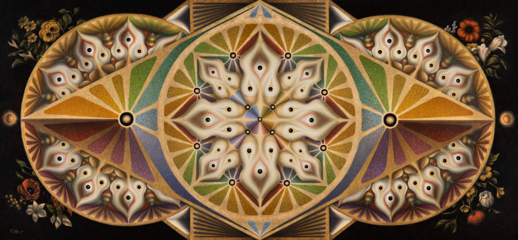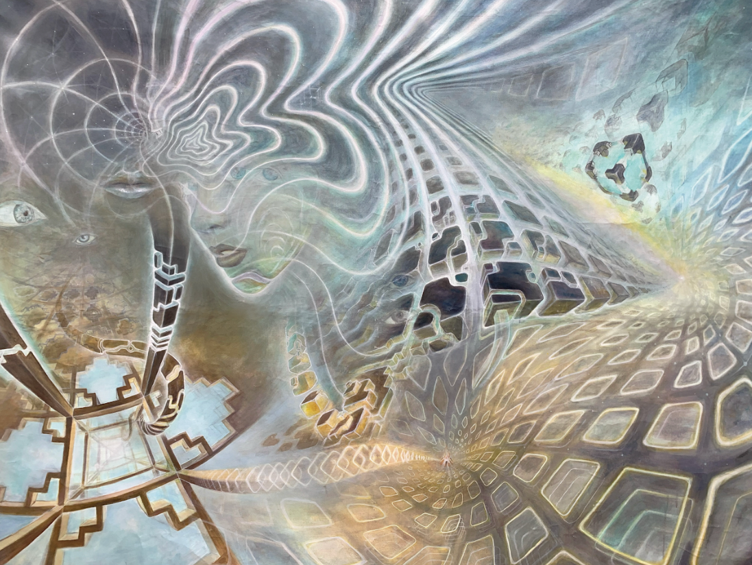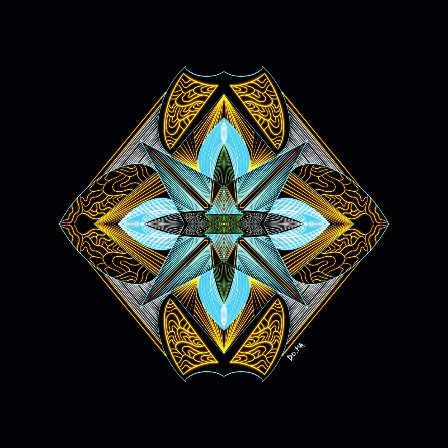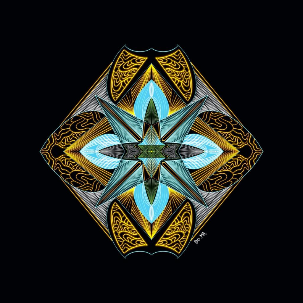 • A luminous exploration of sacred geometry and universal patterns, this artwork radiates symmetry, balance, and spiritual depth. Golden fractal structures and geometric forms interweave to symbolize unity, flow, and the infinite connections binding existence together.