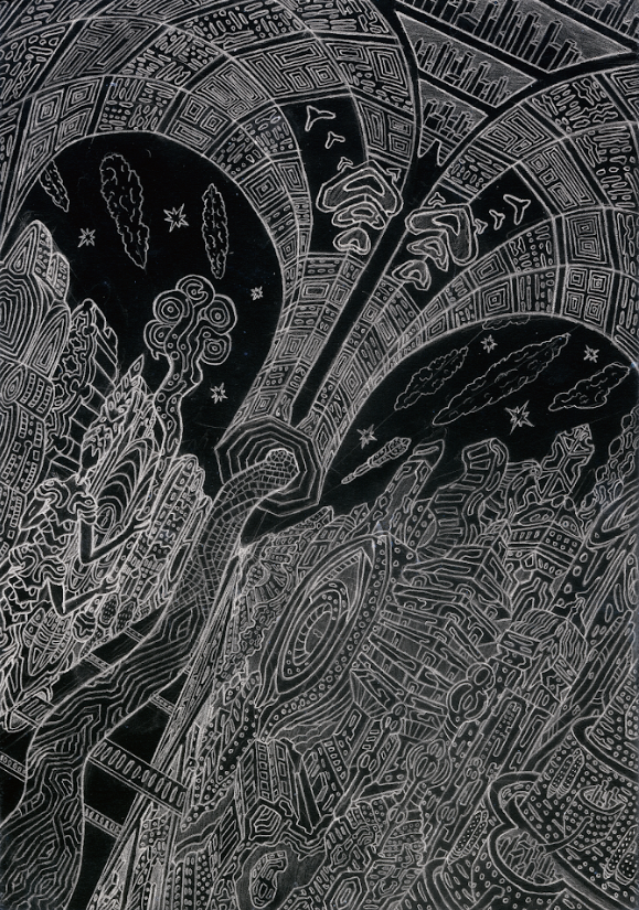 “The chime boomed all over the city, making the uneasy silence that came before it sound just as equally pronounced. It was time. The streets, the hundreds of levels of sliding streets and city blocks filled with crowds of people made no sound, not even the hush of someone’s breath could be heard. All were tensing. In their millions. And then it came, in the ultramarine blue of the twilight sky, a crackling of electricity, so great as to make storms look like mere flashlights. Great splintering stems of jutting bolts wormed their way through the fabric of the sky, some branches echoing that ancient symbolic pattern of primitive Gaian circuit-boards as if to make a statement…No this was not just some catastrophe and event of mother nature, this clearly had intention, this great and terrible cyclone had presence, intelligence….a will of it’s own”